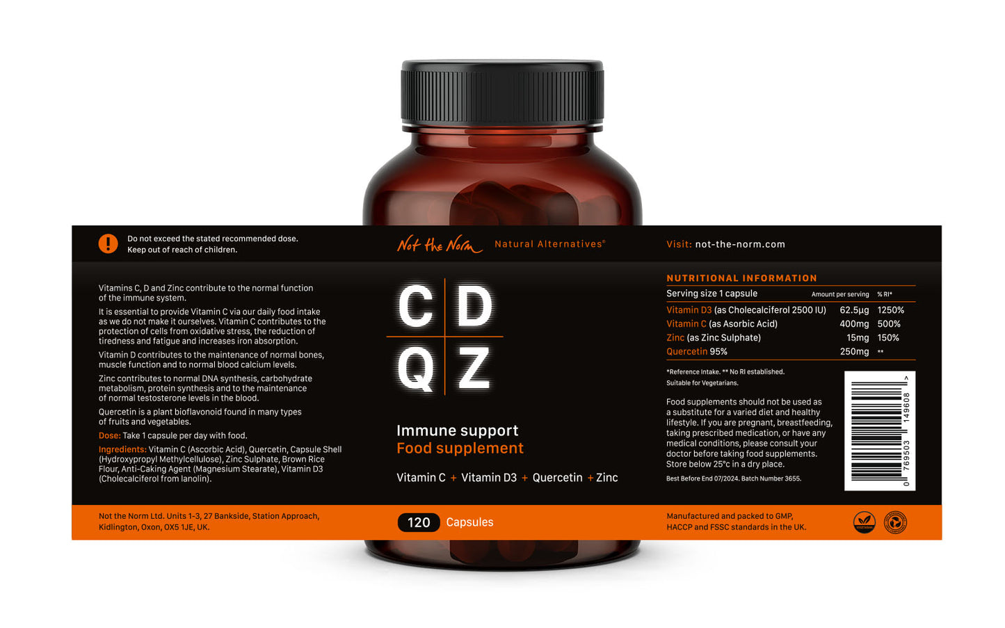 This provides a balanced level of Vitamin C, D3, Zinc and Quercetin to help maintain normal immune function and antioxidant protection.